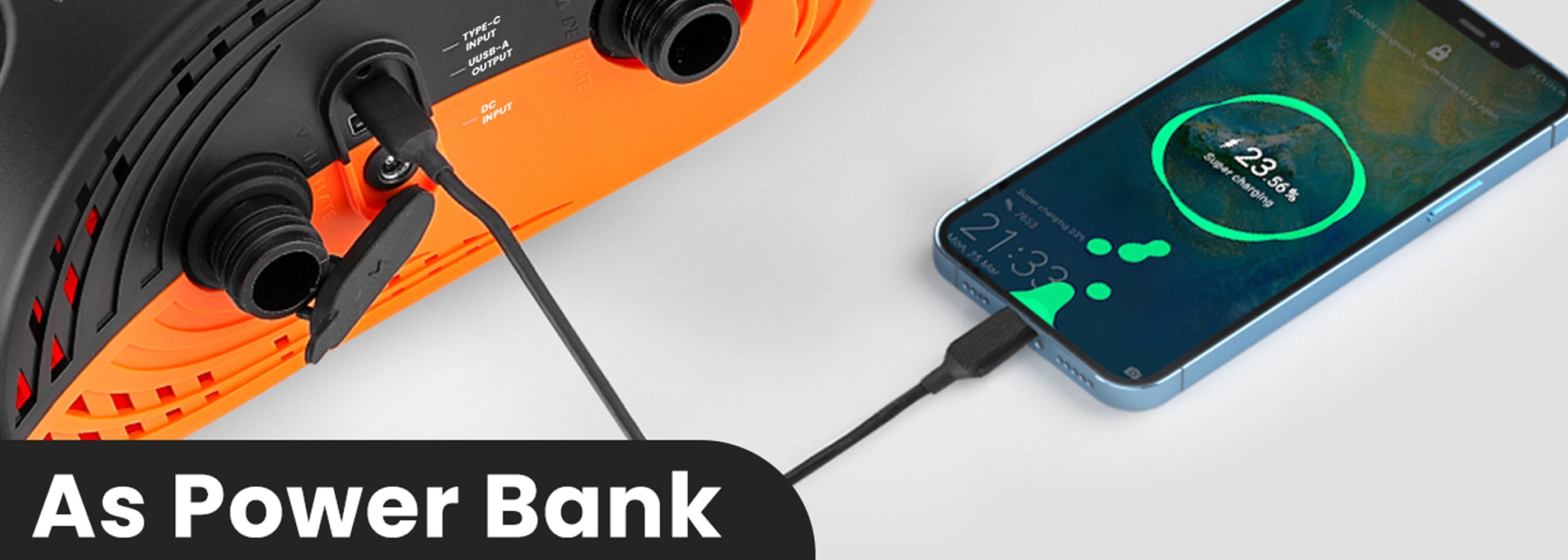 Never worry about power supply limits again! Enjoy the flexibility of 12V DC and battery options. If the battery runs low or you forget to charge it, easily recharge on the go using the car cigarette lighter, power station, or OutdoorMaster SUP pump power bank. Plus, the USB port doubles as a power bank, ensuring connectivity wherever and whenever you need it.